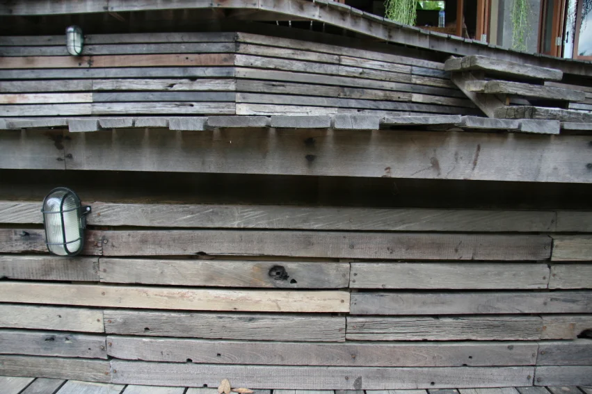 Made entirely of reclaimed Ulin ironwood such as decking, flooring, paneling, ceiling and even beams in addition with glass, banana fiber paper and other rich materials.
